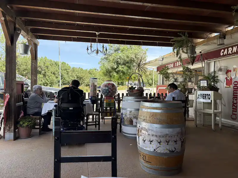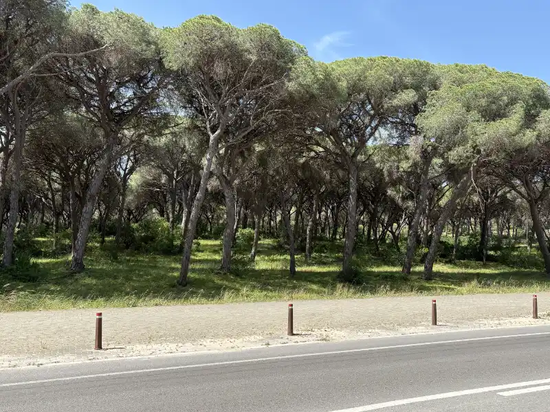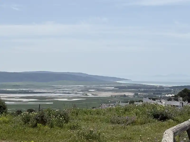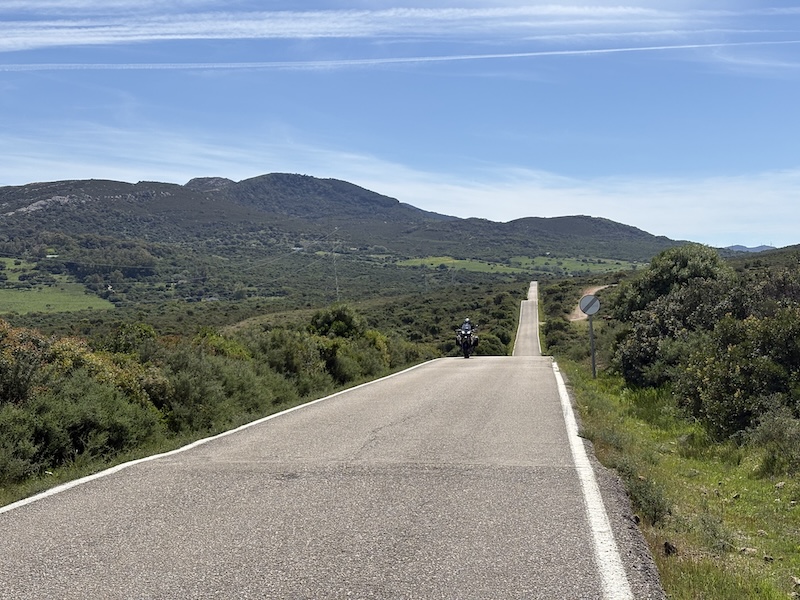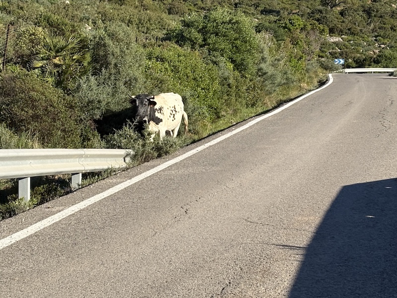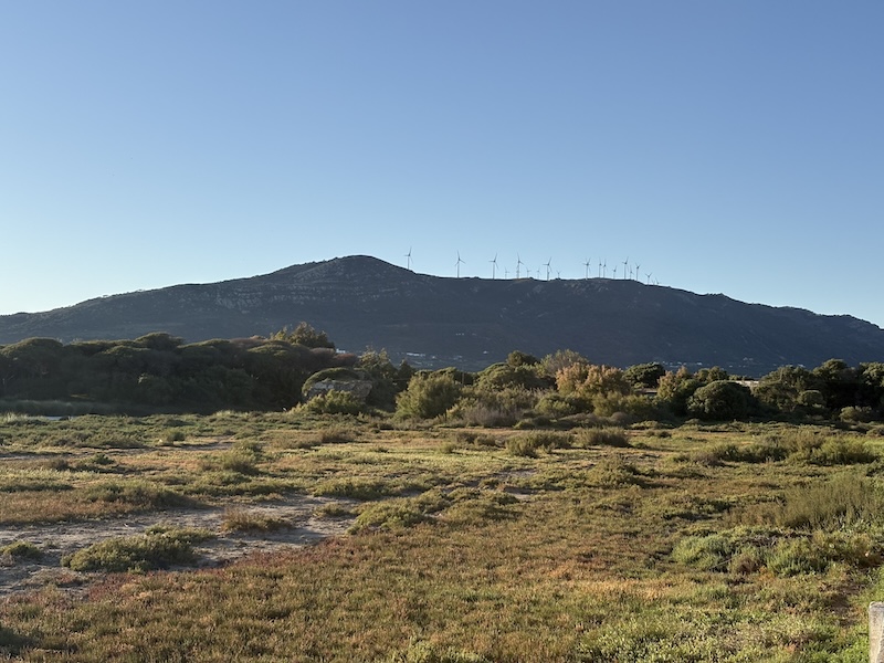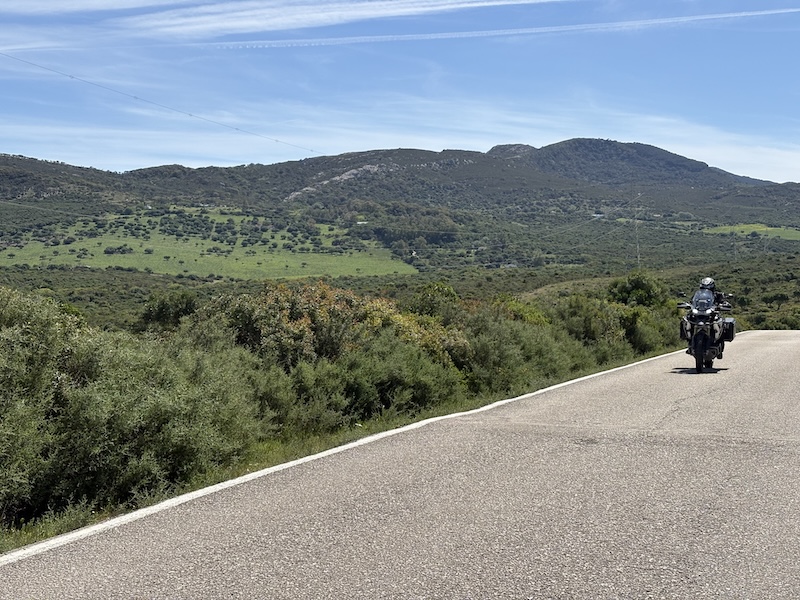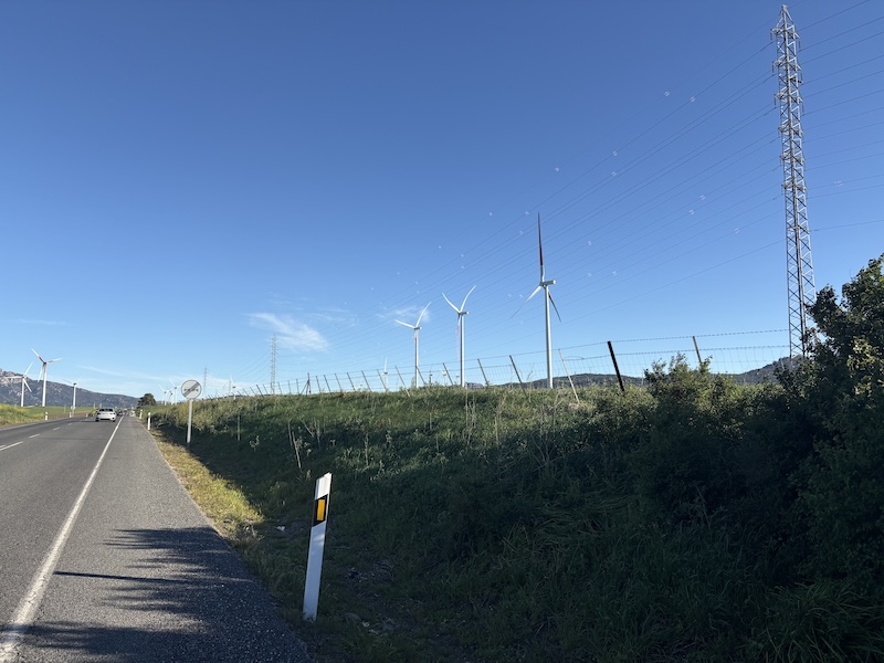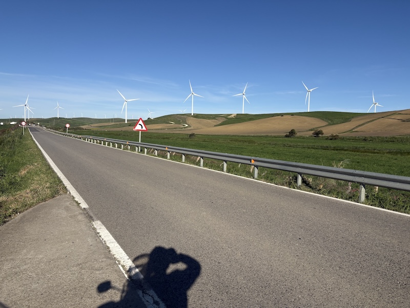 Ich habe heute nach dem. Frühstück einen netten Schweizer – Dennis- kennengelernt. Das geht so wie bei den Hundebesitzern. Man stellt sich an das Motorrad schaut interessiert und mit Kennermiene und schon kommt ein Gespräch in Gang. Je nachdem wie der Andere oder auch die Andere gestrickt ist, gibt ein Wort das andere, heute mündete es in einer gemeinsamen Ausfahrt. Über das Facinas, etwa 30 km im Landesinneren fahren wir nach Barbate und lassen es uns in einer Bar am Strand gut gehen. Wir haben dann eigentlich dann ganzen Nachmittag verquatscht, was für mich nach 3 Tagen Selbstgesprächen eine sehr schöne Abwechslung war. Zu Barbate ist eigentlich nur zu sagen, dass Franco eine Retortenstadt an die Küste gebaut hat und, abgesehen von der Lage und einem beeindruckenden Pinienwald, gibt nichts bemerkenswertes. Kurz vor San Fernando haben wir uns im Baustellendurcheinenader verloren. Ich habe mich in der Altstadt komplett verzettelt, da durch die Einbahnstraßenregelung eine Durchquerung nicht möglich war… ich habe dann aufgegeben und bin wieder zurückgefahren. Der Wind bläst ganz ordentlich, deutlich spürbar auf dem Moped sobald man aus dem Windschatten kommt. An den geeigneten Stellen wird ein Windpark in die Landschaft gestellt, diese ist aber ohnehin nicht mehr reine Natur sondern schon ordentlich vom Menschen überformt. So werden Boden und Luft optimal genutzt. Neben diesen intensiv genutzten Flächen gibt es aber auch ganz viele extensive Flächen und viele große Naturschutzgebiete.