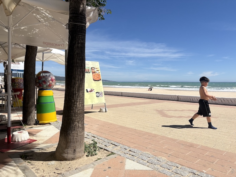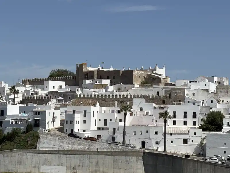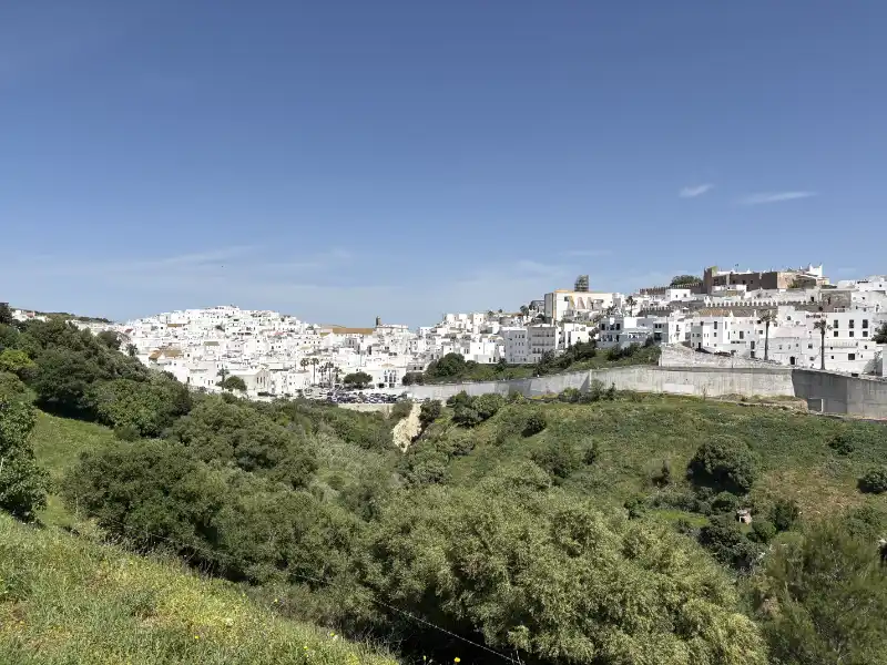 Heute fahre ich weiter Richtung Westen, dabei wiederholt sich die Tour von gestern zum Teil. Dieser Teil von Andalusien ist nicht so extrem erschlossen und es gibt einfach nicht so viele Straßen. Zudem gibt es beispielsweise bei Barbate, ein riesengroßes Sumpf und Überschwemmungsgebiet, allenthalben ragen Berge und Gebirgszüge empor, und damit reduziert sich schon enorm die Möglichkeit, die Landschaft mit Straßen zu überziehen. Ich habe mir die beiden Weißen Dörfer – Puebla Blancas- Vejer de la Frontera und Midonia Sidonia ein bisschen angesehen. Eigentlich ist es eher ein Durchstochern, verliere mich auch diesmal in den Gassen, die zudem extrem steil und schmal sind. Ehe ich mich versehe, bin ich auch schon wieder aus den Orten. Da ich in beiden Dörfern bei einer früheren Reise schon einmal war, und mich tatsächlich auch noch an vieles wieder erinnern konnte, habe ich mich mit dem Durchfahren arrangiert. Auch heute gibt es wieder reichlich Wind Richtung Meer, was die Windparks erfreut, aber zum Fahren teilweise ganz schön herausfordernd ist. Da geht dann auch Vorsicht vor Geschwindigkeit, vor allem, weil mich der Wind ordentlich Richtung Fahrbahnmitte drängt und ich nicht alleine unterwegs bin. Nach einem leckeren Mittagessen und einer ausgiebigen Pause komme ich dann auf dem Campingplatz an. Er heißt Aguadulce, was Süßwasser bedeutet, das ich jetzt aber als Oberflächenwasser in Form eines Sees oder Flusses nicht gesehen habe. Diesmal liegt der Campingplatz wirklich weit ab von einer großen Straße und ich bin gute Hoffnung, mal eine Nacht durchschlafen zu können. Der Campingplatz ist von spanischen Familien vor allem für das Wochenende belegt. Entsprechend lustig und trubelig geht es zu. Zudem scheint es ein Fußballspiel zu geben, denn aus den festen Bungalows gibt es immer wieder laute Anfeuerungsrufe.